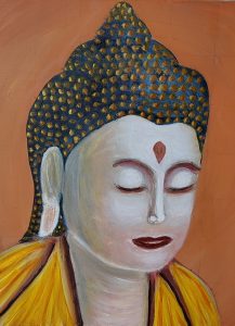 was inspired by my visit to Samye Ling the first Western Buddhist centre in Scotland before coming out to live in New Zealand in 2004. I spent some time enjoying the meditations and peaceful surroundings and learning how to draw Buddhist tanke art. The buddha’s face is very proportional and exact. I painted this Buddha in NZ about 4 years ago and I found the features became both male and female which denotes balance. Peace and balance which are so important in these transitional times as we find our inner calm spaces.