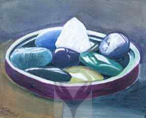 is a painting inspired by the vibrational qualities of crystalline energy and their effects on the human energy field, especially the nervous system and the emotional body. The pink rose quartz emits gentle vibrations of love (higher dimension and self-love). The purple amethyst emits vibrations of spiritual upliftment, meaning, belonging. Both the gold flecked quartz & the copper flecked quartz above are from other worlds, soon to be on earth. I could see them with my intuitive perception The qualities at this time are unknown. I feel both will bring humanity more joy and clearer purpose. Together, the painting of the 4 crystals will bring an uplifting and balanced energy to your home.