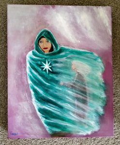 In the magic of my therapy work clients often report having the feeling of a loved one close by who has passed over into the other realms. The feeling of love and support is palpable. The image of the cloak with a mother figure was inspired by idea of ancestors within your aura, a version of the Maori “whakapapa in the Korowai” feathered cloak. In the top right hand corner are the angelic helpers that guide us through life.